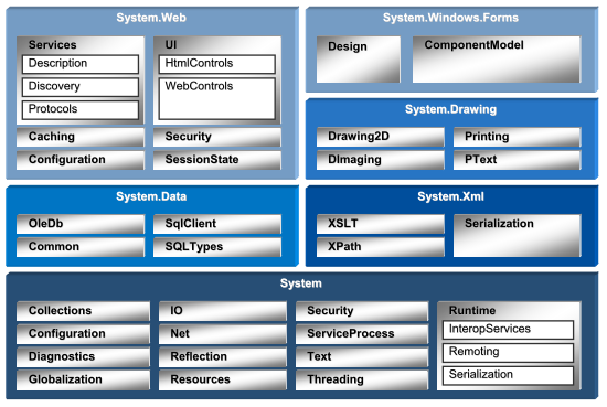 Một khái niệm không được thể hiện trong hình vẽ trên nhưng cần đề cập đến là Namespace. Đây là tên gọi một nhóm các lớp đối tượng phục vụ cho một mục đích nào đó. Chẳng hạn, các lớp đối tượng xử lý dữ liệu sẽ đặt trong một namespace tên là Data. Các lớp đối tượng dành cho việc vẽ hay hiển thị chữ đặt trong namespace tên là Drawing. Một namespace có thể là con của một namespace lớn hơn. Namespace lớn nhất trong .NET Framework là System.