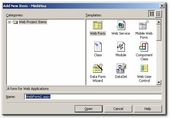 Chúng ta có thể thay đổi tên của Project tại điều khiển Location. Trong ví dụ này, chúng tôi thay đổi tên Project WebApplication1 thành MinhHoa.