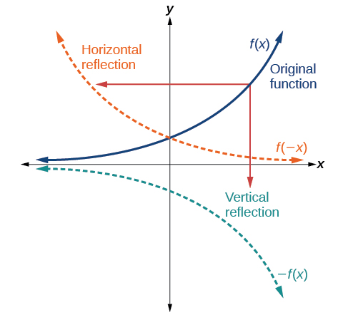 Another transformation that can be applied to a function is a reflection over the x- or y-axis. A vertical reflection reflects a graph vertically across the x-axis, while a horizontal reflection reflects a graph horizontally across the y-axis. The reflections are shown in [link].