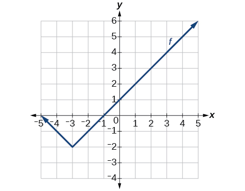 The functionis our toolkit absolute value function. We know that this graph has a V shape, with the point at the origin. The graph ofhas transformedin two ways:is a change on the inside of the function, giving a horizontal shift left by 1, and the subtraction by 3 inis a change to the outside of the function, giving a vertical shift down by 3. The transformation of the graph is illustrated in [link].