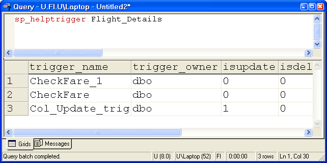 Sử dụng thủ tục hệ thông sp_helptrigger để hiển thị danh sách các trigger trong cơ sở dữ liệu hiện tại.