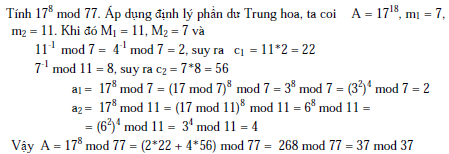 - Tính toán theo modulo số lớn. Để tính A mod M, với M khá lớn và A là biểu thức số học nào đó. Trước hết ta cần tính tất cả ai = A mod mi. Sau đó sử dụng công thức