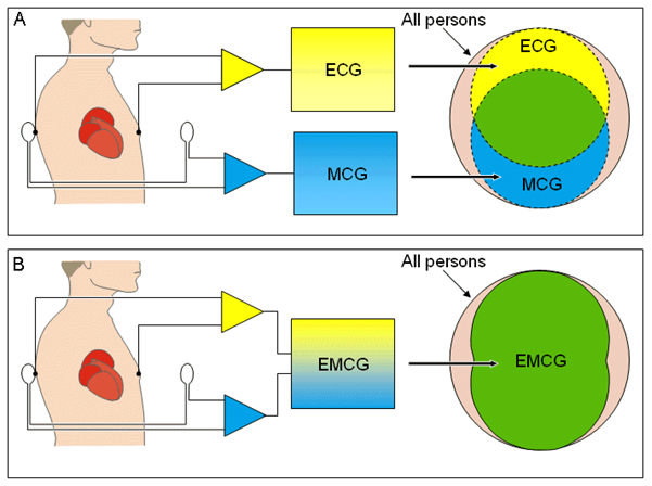 Bởi vì chúng ta không biết những bệnh nhân nào được chẩn đoán đúng với ECG mà lại bị sai với MCG, hoặc ngược lại, với từng hệ thống chẩn đoán riêng rẽ dùng ECG và MCG, chúng ta không thể tăng chất lượng chẩn đoán tổng cộng. (nếu chúng ta có thể biết những bệnh nhân nào được chẩn đoán đúng, bệnh nhân nào bị chẩn đoán sai, thì chất lượng chẩn đoán dĩ nhiên sẽ là 100%!). Chất lượng chẩn đoán tổng cộng chỉ có thể tăng lên nếu quá trình chẩn đoán bao gồm cả tín hiệu điện và từ trong việc hình thành phép đo điện từ tâm đồ (EMCG). Chất lượng chẩn đoán của hệ thống kết hợp do đó sẽ là vùng được bao bởi cả 2 vòng tròn ECG và MCG.