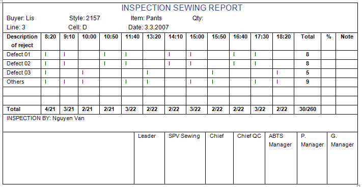 - The upper corner of the checklist should contain information about the buyers, style, items and quantity, the production line and dates of inspection. Observed period, e.g. a day, should be written in the top line of the sheet.