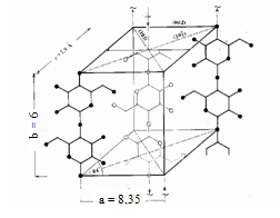 - Cấu tạo tinh thể xenluloza: Theo các nhà nghiên cứu tia Rơnghen thì các phân tử xenluloza được sắp xếp thành mạng tinh thể. Mạng tinh thể gồm một hệ vô hạn các ô mạng cơ sở hình hộp còn gọi là tinh thể cơ sở sắp xếp kín trong không gian. Tinh thể cơ sở có đối xứng monoklin được cấu tạo như sau: ([link]).
