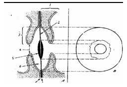 1. Cặp lỗ đơn; 2- Phiến giữa kép; 3- Vách với các sợi liên bào; 4-Phiến giữa; 5- Màng lỗ; 6- Khoang lỗ; 7- Lỗ nhìn qua bề mặt; 8- Vách sơ cấp; 9- Sợi liên bào ở vùng lỗ sơ cấp; 10- Khoảng gian bào.