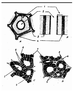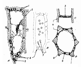 1. vách thứ cấp 3 lớp; 2- Khoang tế bào; 3- Chất gian bào; 4- vách sơ cấp 5; Cặp lỗ đơn 6- Phiến giữa (chấm nhỏ); 9- Lỗ phân nhánh; 7 = vách thứ cấp; 8 = phiến giữa.