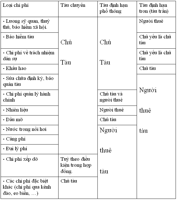 - Về phân chia chi phí giữa các phương thức thuê tàu: