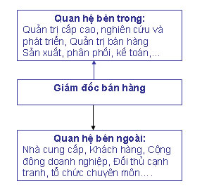 Người giám đốc bán hàng tồn tại như một chức vụ và như một con người trong cơ cấu tổ chức. Là một con người, giám đốc bán hàng duy trì một hệ thống thông tin mở rộng trong cũng như ngoài công ty. Tuy rằng mô hình quan hệ có thể thay đổi nhiều tùy theo công ty và có thể tùy từng giám đốc nhưng [link] là một mô hình hợp lý về mạng lưới thông tin liên lạc của giám đốc cả trong hệ thống tổ chức và theo một cơ sở thường xuyên, cả với môi trường bên ngoài.