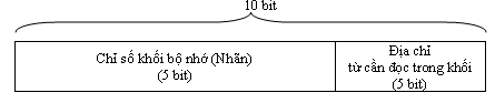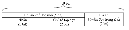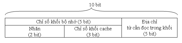 Ví dụ: phân tích địa chỉ một từ trong được cho ở trên, địa chỉ xác định một từ trong bộ nhớ có 10 bit, tuỳ theo cách xếp đặt khối mà ta có thể phân tích địa chỉ này thành các thành phần như sau:
