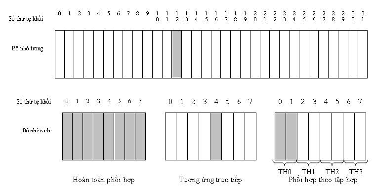 - Kiểu hoàn toàn phối hợp: trong kiểu đặt khối này, một khối trong bộ nhớ trong có thể được đặt vào vị trí bất kỳ trong cache.