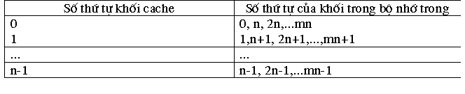 Như vậy, trong kiểu xếp đặt khối này, mỗi vị trí đặt khối trong cache có thể chứa một trong các khối trong bộ nhớ cách nhau xn khối (x: 0,1,...,m; n: số khối của cache)