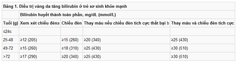 1. Tăng dịch chuyền tỉnh mạch duy trì 0,5 mL/kg/giờ (12 mL/kg/24 giờ) nếu trẻ cân nặng < 1500 g và 1 mL/kg/giờ (24 mL/kg/24 giờ) nếu trẻ cân nặng > 1500 g. (Chú ý: Bổ sung nước cho trẻ bú sữa mẹ không làm giảm bilirubin huyết thanh). Nhớ rằng duy trì bù nước đầy đủ và lượng nước tiểu tốt giúp chiếu đèn hiệu quả vì các sản phẩm phụ là nguyên nhân của giảm bilirubin được bài tiết một phần qua nước tiểu. Bảng 1. Điều trị vàng da tăng bilirubin ở trẻ sơ sinh khỏe mạnh