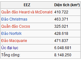 Úc là quốc gia lớn thứ ba về diện tích của Vùng đặc quyền kinh tế, sau Mỹ và Pháp, và đứng trên Nga, với tổng diện tích thực tế còn lớn hơn diện tích vùng đất liền của mình. Theo công ước của Liên hiệp quốc, vùng đặc quyền kinh tế của Úc nói chung mở rộng thêm 200 hải lý (370,4 km) từ bờ biển của Úc cũng như các lãnh thổ ben ngoài của quốc gia này, ngoại trừ các khu vực mà theo thỏa thuận giữa Úc và các quốc gia liên quan thì nó nhỏ hơn. Úc cũng đòi hỏi trong các đệ trình của mình tới Ủy ban của Liên hiệp quốc về biển dành cho các giới hạn về thềm lục địa và vùng đặc quyền kinh tế tới 200 hải lý đối với Lãnh thổ Nam Cực thuộc Úc nhưng yêu cầu này không được chấp nhận do các quy định trong Hiệp ước Nam Cực. Tuy vậy, Úc vẫn duy trì được quyền khai thác và thám hiểm đáy biển và vùng nước trong phạm vi vùng đặc quyền kinh tế này.