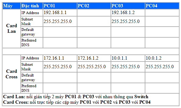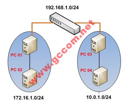 Ta nhận thấy máy PC01 chỉ thấy duy nhất máy PC03 lý do nó cùng mạng 192.168.1.0/24, mặc dù nó nối trực tiếp với PC02 thông qua Card Cross nhưng vẫn không thấy vì PC02 khác mạng với nó