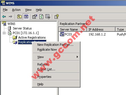 Trong màn hình WINS của PC03 ta nhấp phải vào mục Replication Partners chọn New Replication Partners