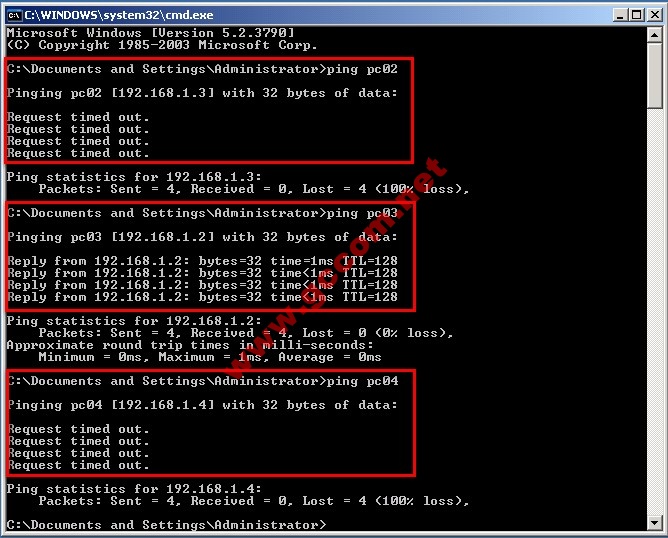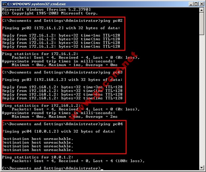 Cuối cùng tại máy PC01 ta ra DOS ping lần lượt tên các máy trong và khác mạng với mình xem thử