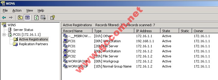 Lúc này tại máy PC01 (WINS Server của mạng 172.16.1.0/24) sẽ hiển thị 2 máy đó là PC01 và PC02