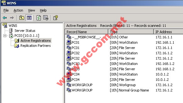 Lúc này tại màn hình WINS của PC01 đã xuất hiện đầy đủ các máy trong cùng và khác mạng với mình với IP và tên máy được hiển thị rõ rệt