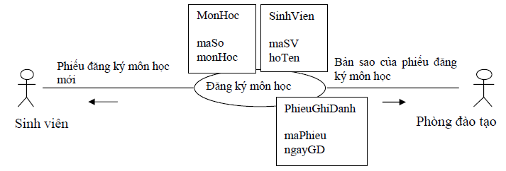 Để có phiếu đăng ký môn học thì phải có sự tham gia của các thực thể: môn học, sinh viên và phiếu ghi danh (trả lời câu hỏi thứ nhất). Môn học phải có thuộc tính: mã số của khoá học, tên môn học, sinh viên phải có thuộc tính: mã SV, họ tên, và phiếu ghi danh có: mã ghi danh, ngày ghi danh, v.v. (trả lời câu hỏi thứ hai). Từ các mục đích, chúng ta xác định được các lớp và các thuộc tính tương ứng như hình 1.