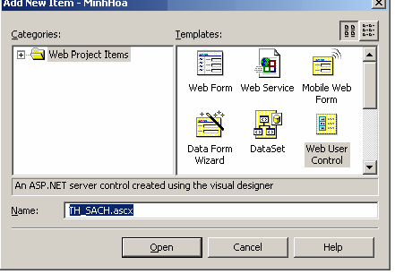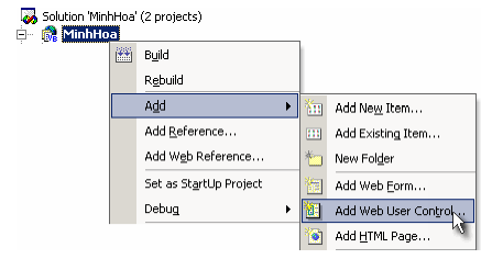 Để tạo mới đối tượng thể hiện, chọn Add | Add Web User Control… từ thực đơn ngữ cảnh của ứng dụng.