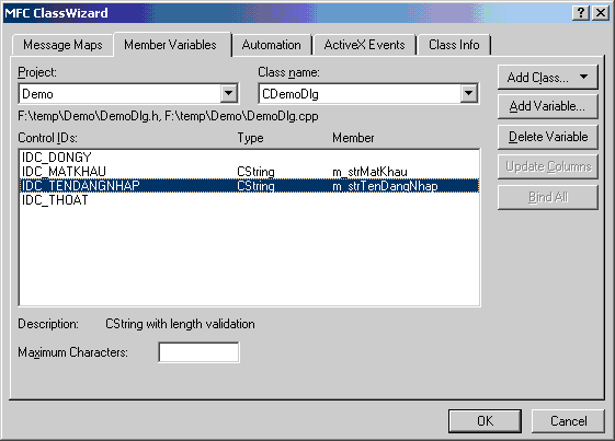 | IDC_TENDANGNHAP | m_strTenDangNhap | CString | Tên đăng nhập |