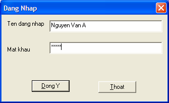 Người sử dụng sẽ nhập vào tên đăng nhập và mật khẩu vào trong 2 hộp thoại tương ứng. Sau khi nhập xong, có thể nhấn vào nút Dong Y để kiểm tra mật khẩu. Nếu mật khẩu và tên đăng nhập hợp lệ, người sử dụng nhận được một thông báo chúc mừng. Ngược lại, người sử dụng phải tiếp tục nhập lại mật khẩu, tên đăng nhập.