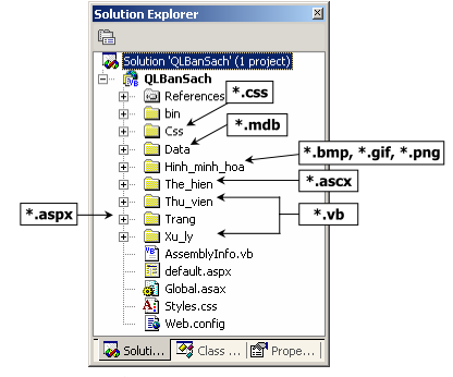 Css: Lưu trữ các tập tin *.css - tập tin qui định hình thức hiển thị.Data: Lưu trữ tập tin *.mdb - tập tin cơ sở dữ liệu.Hinh_minh_hoa: Lưu trữ các tập tin hình ảnh (*.bmp, *.gif, *.png, …)