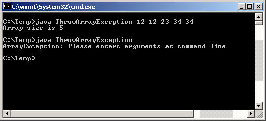Viết chương trình gây ra ngoại lệ khi người sử dụng không nhập tham số nào vào từ dòng lệnh. Chương trình phải hiện thị số tham số nếu có tham số được nhập vào từ dòng lệnh. Đầu ra của chương trình như sau: