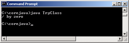 Khối ‘catch()’ bắt giữ bất cứ các lỗi xảy ra trong khi thi hành phương thức ‘doFileProcessing’ hay ‘display’. Nếu một lỗi xảy ra trong khi thi hành phương thức ‘doFileProcessing()’, lúc đó phương thức ‘displayResults()’ sẽ không bao giờ được gọi. Chương trình sẽ chuyển đến thực hiện khối ‘catch’. Để có nhiều lớp xử lý lỗi hơn, như là ‘LookupException’ thay vì một đối tượng ngoại lệ chung (Exceptione), lỗi thực tế có thể là một đối tượng thuộc lớp 'LookupException’ hay một trong số những lớp con của nó. Lỗi sẽ được truyền qua khối ‘try catch’ cho tới khi gặp ‘catch’ của nó, nếu không tìm thấy chương trình phải dừng thực hiện và thoát.