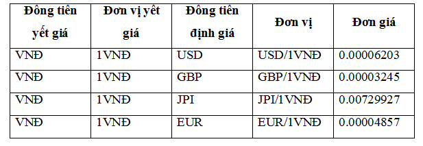 Trong phương pháp này, nội tệ là đồng tiền yết giá có số đơn vị cố định, thường bằng 1, cũn ngoại tệ đóng vai trũ là đồng tiền định giá có số đơn vị thay đổi. Và nhỡn vào bảng niờm yết ta cú thể thấy tỉ lệ trao đổi:
