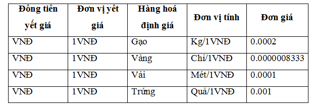 Mà nếu chỳng ta muốn biết giá của hàng hoỏ thì bắt buộc chỳng ta phải thực hiện một vài phộp tớnh chuyển đổi. Và trong phương pháp này VNĐ đóng vai trũ là đồng tiền định giá với số đơn vị cố định và thường bằng 1, cũn những hàng hoỏ như: gạo, vàng, vải, trứng... đóng vai trũ là hàng hoỏ định giá với số đơn vị thay đổi.