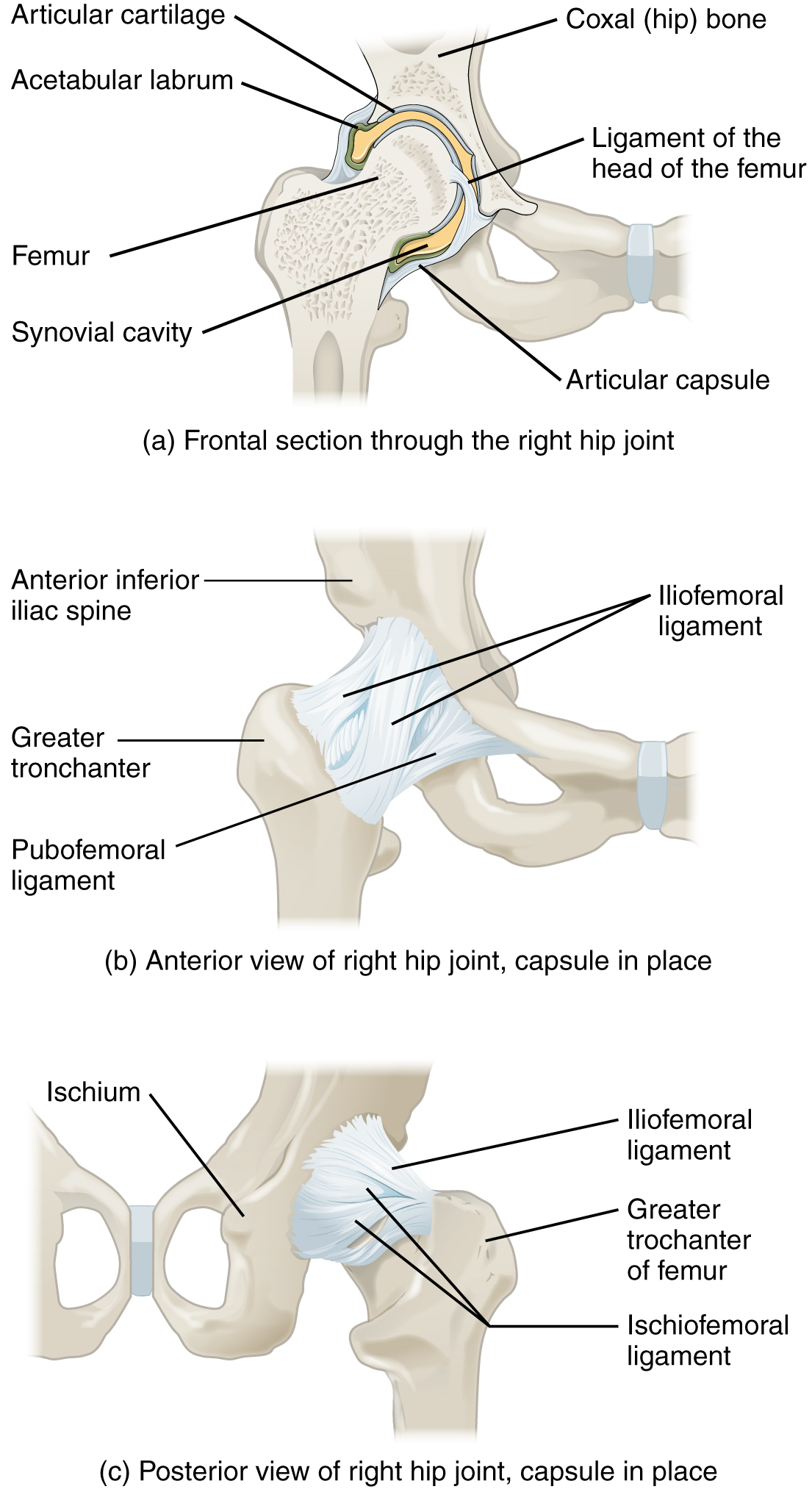 The acetabulum is the socket portion of the hip joint. This space is deep and has a large articulation area for the femoral head, thus giving stability and weight bearing ability to the joint. The acetabulum is further deepened by the acetabular labrum, a fibrocartilage lip attached to the outer margin of the acetabulum. The surrounding articular capsule is strong, with several thickened areas forming intrinsic ligaments. These ligaments arise from the hip bone, at the margins of the acetabulum, and attach to the femur at the base of the neck. The ligaments are the iliofemoral ligament, pubofemoral ligament, and ischiofemoral ligament, all of which spiral around the head and neck of the femur. The ligaments are tightened by extension at the hip, thus pulling the head of the femur tightly into the acetabulum when in the upright, standing position. Very little additional extension of the thigh is permitted beyond this vertical position. These ligaments thus stabilize the hip joint and allow you to maintain an upright standing position with only minimal muscle contraction. Inside of the articular capsule, the ligament of the head of the femur (ligamentum teres) spans between the acetabulum and femoral head. This intracapsular ligament is normally slack and does not provide any significant joint support, but it does provide a pathway for an important artery that supplies the head of the femur.