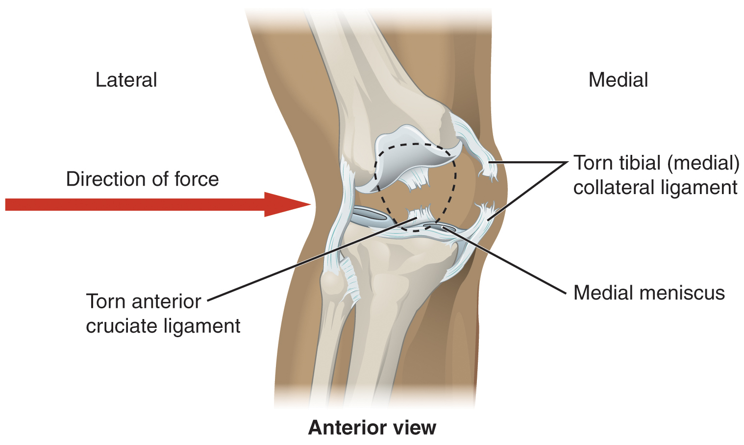 A worse combination of injuries can occur with a hit to the lateral side of the extended knee ([link]). A moderate blow to the lateral knee will cause the medial side of the joint to open, resulting in stretching or damage to the tibial collateral ligament. Because the medial meniscus is attached to the tibial collateral ligament, a stronger blow can tear the ligament and also damage the medial meniscus. This is one reason that the medial meniscus is 20 times more likely to be injured than the lateral meniscus. A powerful blow to the lateral knee produces a “terrible triad” injury, in which there is a sequential injury to the tibial collateral ligament, medial meniscus, and anterior cruciate ligament.