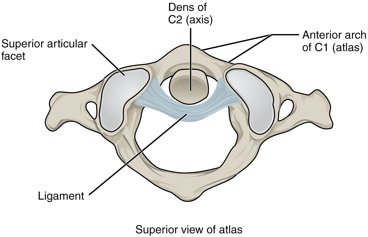 The atlantoaxial joint, between the atlas and axis, consists of three articulations. The paired superior articular processes of the axis articulate with the inferior articular processes of the atlas. These articulating surfaces are relatively flat and oriented horizontally. The third articulation is the pivot joint formed between the dens, which projects upward from the body of the axis, and the inner aspect of the anterior arch of the atlas ([link]). A strong ligament passes posterior to the dens to hold it in position against the anterior arch. These articulations allow the atlas to rotate on top of the axis, moving the head toward the right or left, as when shaking your head “no.”