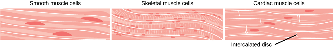 There are three types of muscle in animal bodies: smooth, skeletal, and cardiac. They differ by the presence or absence of striations or bands, the number and location of nuclei, whether they are voluntarily or involuntarily controlled, and their location within the body. [link] summarizes these differences.