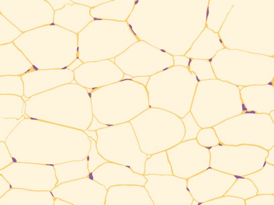 Adipose tissue, or fat tissue, is considered a connective tissue even though it does not have fibroblasts or a real matrix and only has a few fibers. Adipose tissue is made up of cells called adipocytes that collect and store fat in the form of triglycerides, for energy metabolism. Adipose tissues additionally serve as insulation to help maintain body temperatures, allowing animals to be endothermic, and they function as cushioning against damage to body organs. Under a microscope, adipose tissue cells appear empty due to the extraction of fat during the processing of the material for viewing, as seen in [link]. The thin lines in the image are the cell membranes, and the nuclei are the small, black dots at the edges of the cells.