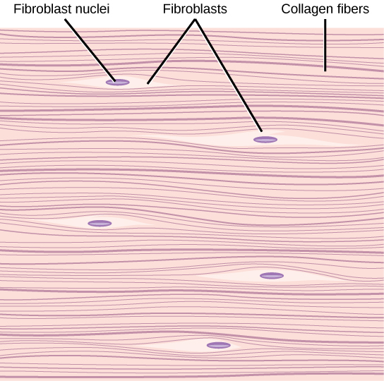 Fibrous connective tissues contain large amounts of collagen fibers and few cells or matrix material. The fibers can be arranged irregularly or regularly with the strands lined up in parallel. Irregularly arranged fibrous connective tissues are found in areas of the body where stress occurs from all directions, such as the dermis of the skin. Regular fibrous connective tissue, shown in [link], is found in tendons (which connect muscles to bones) and ligaments (which connect bones to bones).