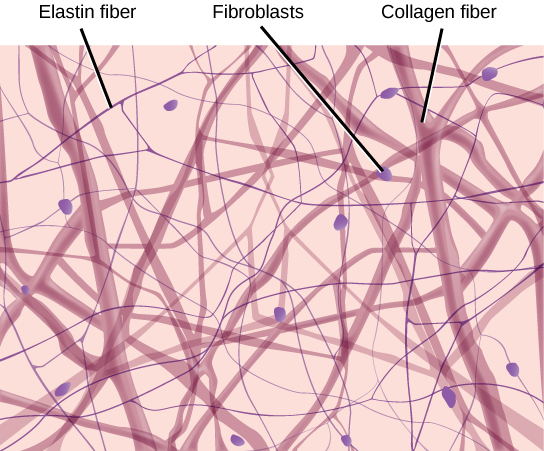 The organic portion or protein fibers found in connective tissues are either collagen, elastic, or reticular fibers. Collagen fibers provide strength to the tissue, preventing it from being torn or separated from the surrounding tissues. Elastic fibers are made of the protein elastin; this fiber can stretch to one and one half of its length and return to its original size and shape. Elastic fibers provide flexibility to the tissues. Reticular fibers are the third type of protein fiber found in connective tissues. This fiber consists of thin strands of collagen that form a network of fibers to support the tissue and other organs to which it is connected. The various types of connective tissues, the types of cells and fibers they are made of, and sample locations of the tissues is summarized in [link].