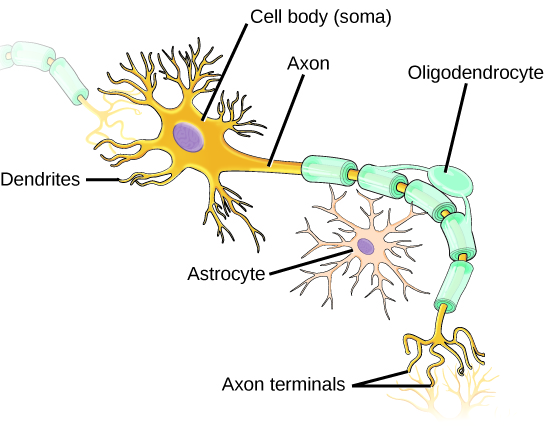 Nervous tissues are made of cells specialized to receive and transmit electrical impulses from specific areas of the body and to send them to specific locations in the body. The main cell of the nervous system is the neuron, illustrated in [link]. The large structure with a central nucleus is the cell body of the neuron. Projections from the cell body are either dendrites specialized in receiving input or a single axon specialized in transmitting impulses. Some glial cells are also shown. Astrocytes regulate the chemical environment of the nerve cell, and oligodendrocytes insulate the axon so the electrical nerve impulse is transferred more efficiently. Other glial cells that are not shown support the nutritional and waste requirements of the neuron. Some of the glial cells are phagocytic and remove debris or damaged cells from the tissue. A nerve consists of neurons and glial cells.