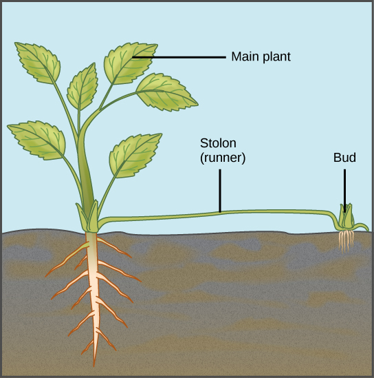 Natural methods of asexual reproduction include strategies that plants have developed to self-propagate. Many plants—like ginger, onion, gladioli, and dahlia—continue to grow from buds that are present on the surface of the stem. In some plants, such as the sweet potato, adventitious roots or runners can give rise to new plants [link]. In Bryophyllum and kalanchoe, the leaves have small buds on their margins. When these are detached from the plant, they grow into independent plants; or, they may start growing into independent plants if the leaf touches the soil. Some plants can be propagated through cuttings alone.