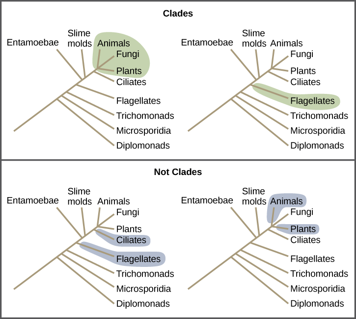 Clades can vary in size depending on which branch point is being referenced. The important factor is that all of the organisms in the clade or monophyletic group stem from a single point on the tree. This can be remembered because monophyletic breaks down into “mono,” meaning one, and “phyletic,” meaning evolutionary relationship. [link] shows various examples of clades. Notice how each clade comes from a single point, whereas the non-clade groups show branches that do not share a single point.