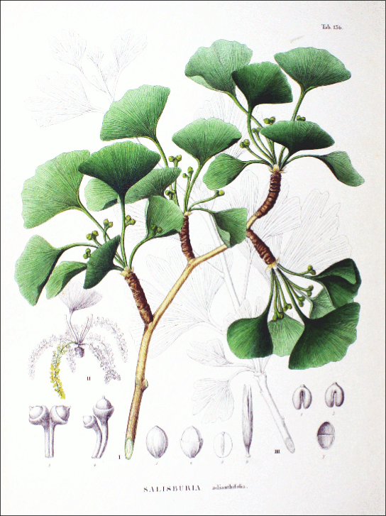 The single surviving species of the gingkophytes group is the Gingko biloba ([link]). Its fan-shaped leaves—unique among seed plants because they feature a dichotomous venation pattern—turn yellow in autumn and fall from the tree. For centuries, G. biloba was cultivated by Chinese Buddhist monks in monasteries, which ensured its preservation. It is planted in public spaces because it is unusually resistant to pollution. Male and female organs are produced on separate plants. Typically, gardeners plant only male trees because the seeds produced by the female plant have an off-putting smell of rancid butter.