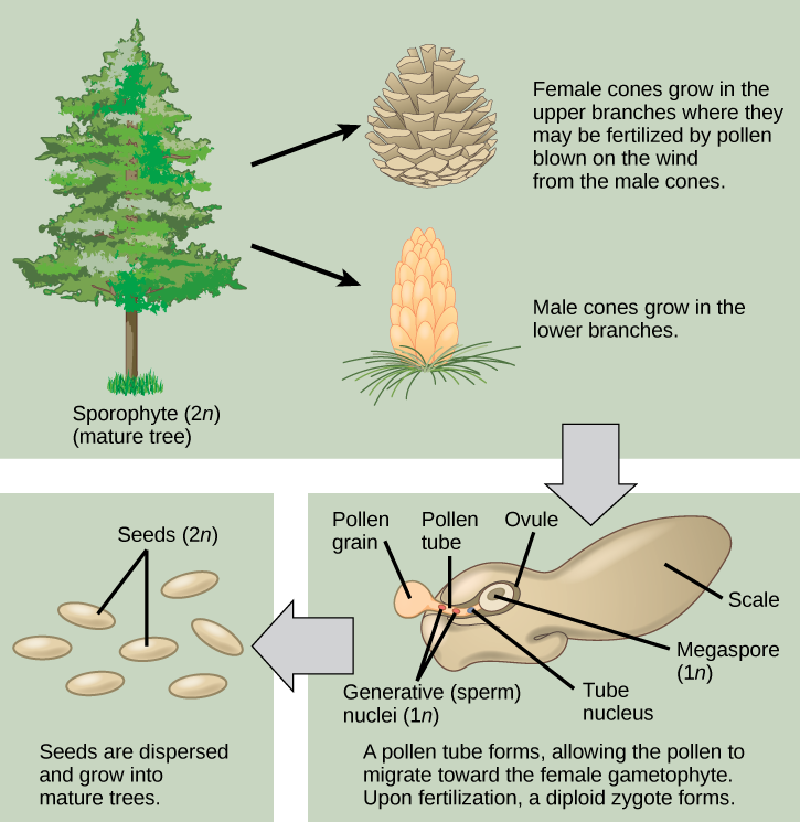 [link] illustrates the life cycle of a conifer. The sporophyte (2n) phase is the longest phase in the life of a gymnosperm. The gametophytes (1n)—microspores and megaspores—are reduced in size. It may take more than year between pollination and fertilization while the pollen tube grows towards the megasporocyte (2n), which undergoes meiosis into megaspores. The megaspores will mature into eggs (1n).