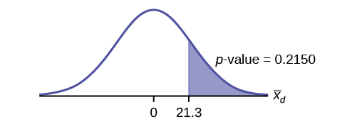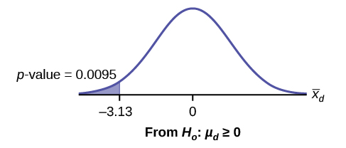 Use your list of differences as the data. Press STAT and arrow over to TESTS. Press 2:T-Test. Arrow over to Data and press ENTER. Arrow down and enter 0 for , the name of the list where you put the data, and 1 for Freq:. Arrow down to μ: and arrow over to < . Press ENTER. Arrow down to Calculate and press ENTER. The p-value is 0.0094, and the test statistic is -3.04. Do these instructions again except, arrow to Draw (instead of Calculate). Press ENTER.