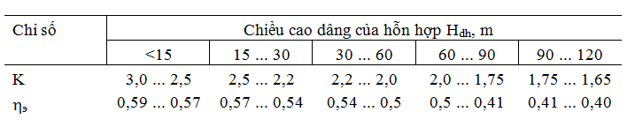 Ở đây K là hệ số nhúng miệng phun, nó nói lên rằng H lớn hơn Hdh bao nhiêu lần. Bảng sau đây cho ta quan hệ giữa K và hiệu suất của bơm nhúng theo Hdh.