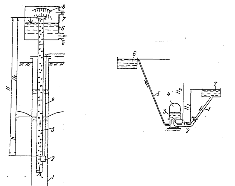 Máy bơm dâng bằng khí nén, còn gọi là bơm sục khí, có thể dâng nước từ các lổ khoan. Loại bơm này được sử dụng rộng rãi hơn cả là bơm nước chứa bùn cát từ các lổ khoan trước khi đặt đặt máy bơm nhúng li tâm, hoặc dâng nước từ lỗ khoan nếu có yêu cầu tách ga khỏi nước. Nguyên tắc hoạt động của bơm này là dùng quy tắc bình thông nhau. Hình 7 - 12, mô tả về cấu tạo của máy bơm sục khí. Khí nén được dẫn theo ống theo ống 4 vào miệng phun 2 vào ống dâng 3. Trong ống 3 nước và khí nén tạo nên hỗn