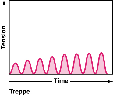 When a skeletal muscle has been dormant for an extended period and then activated to contract, with all other things being equal, the initial contractions generate about one-half the force of later contractions. The muscle tension increases in a graded manner that to some looks like a set of stairs. This tension increase is called treppe, a condition where muscle contractions become more efficient. It’s also known as the “staircase effect” ([link]).