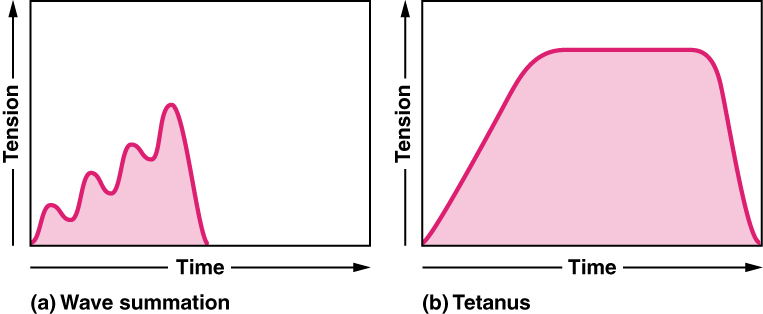 The rate at which a motor neuron fires action potentials affects the tension produced in the skeletal muscle. If the fibers are stimulated while a previous twitch is still occurring, the second twitch will be stronger. This response is called wave summation, because the excitation-contraction coupling effects of successive motor neuron signaling is summed, or added together ([link]a). At the molecular level, summation occurs because the second stimulus triggers the release of more Ca++ ions, which become available to activate additional sarcomeres while the muscle is still contracting from the first stimulus. Summation results in greater contraction of the motor unit.