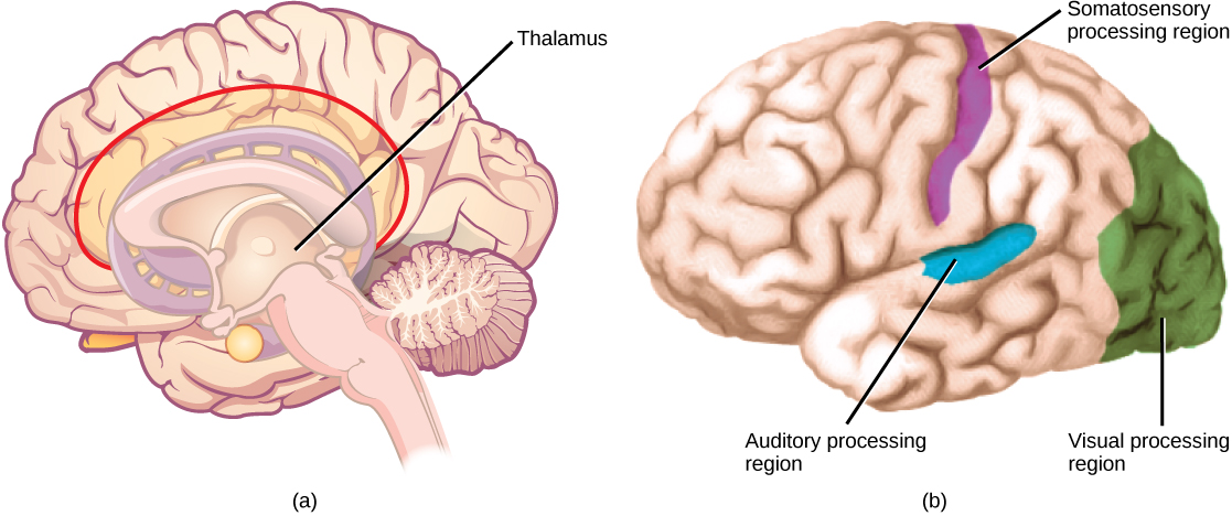 All sensory signals, except those from the olfactory system, are transmitted though the central nervous system and are routed to the thalamus and to the appropriate region of the cortex. Recall that the thalamus is a structure in the forebrain that serves as a clearinghouse and relay station for sensory (as well as motor) signals. When the sensory signal exits the thalamus, it is conducted to the specific area of the cortex ([link]) dedicated to processing that particular sense.